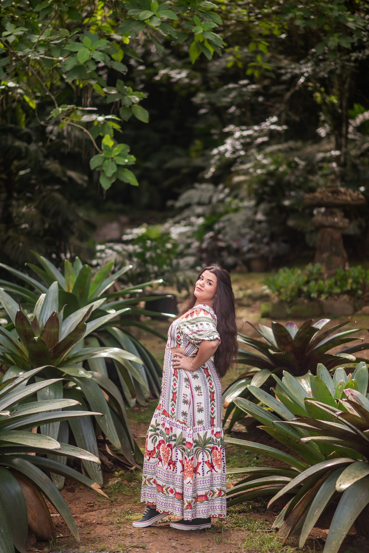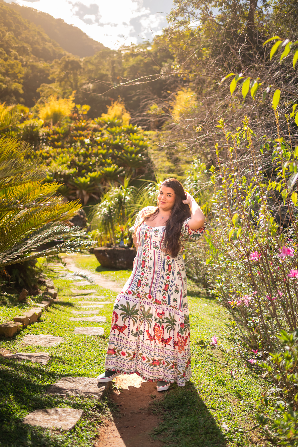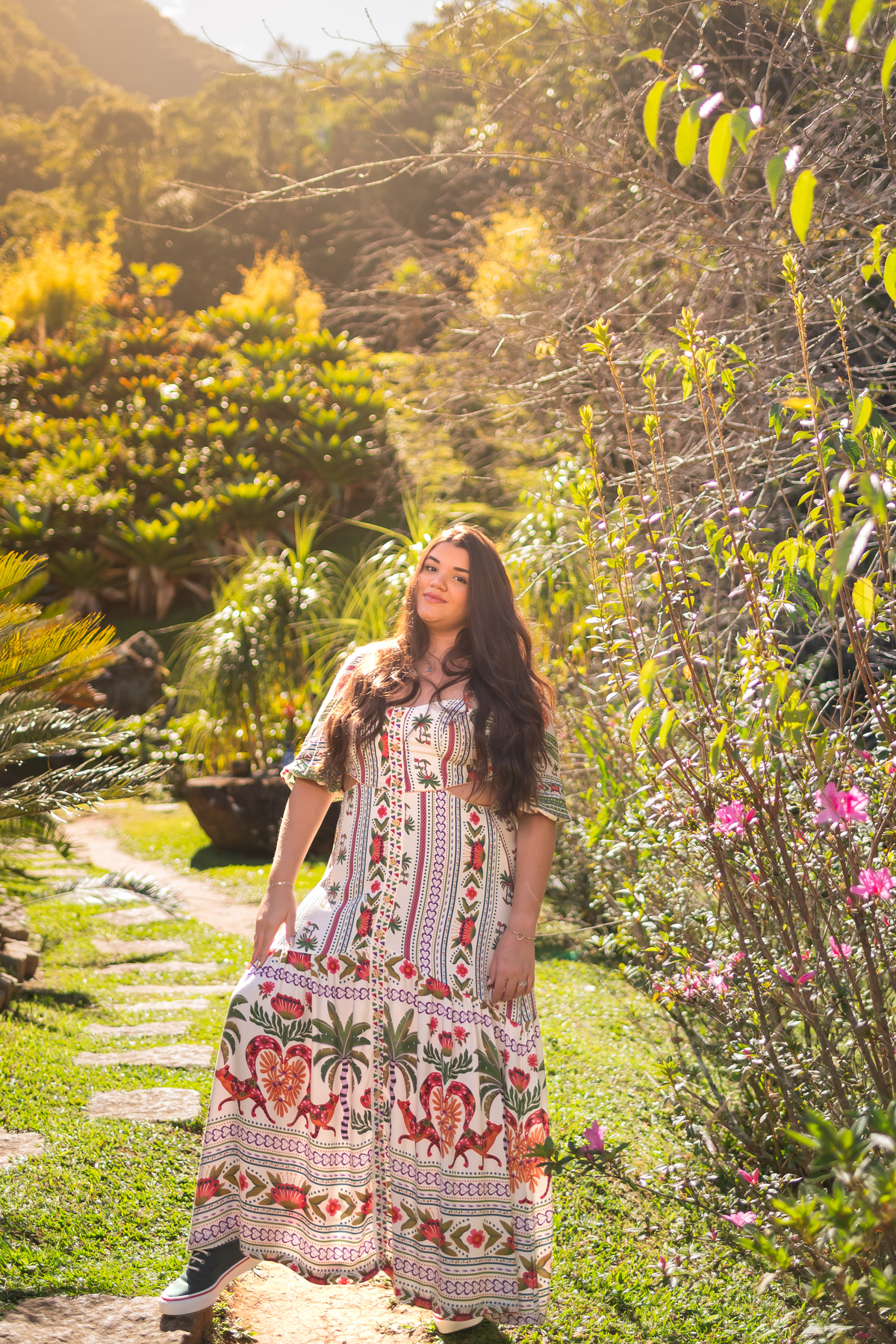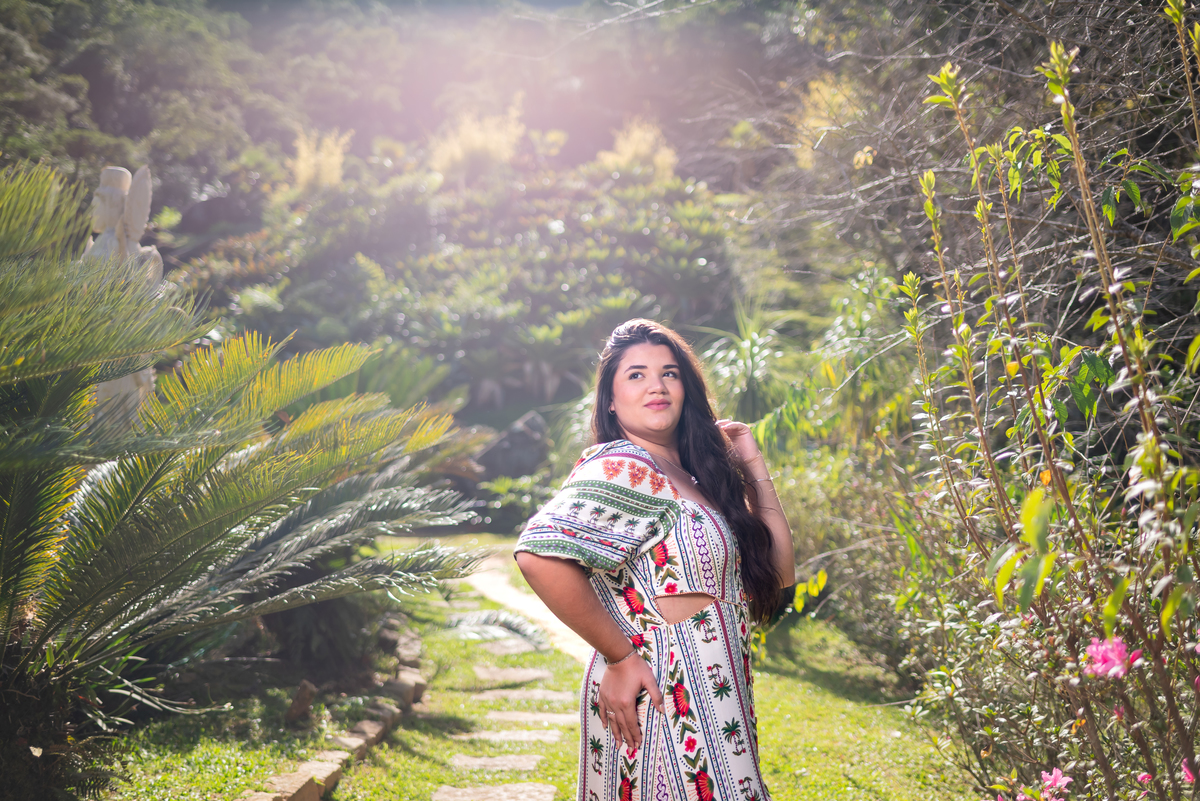 Alice, radiante em seu vestido em cores quentes, passeou pelos caminhos floridos do jardim, cercada por árvores frondosas e flores coloridas. A luz suave do entardecer iluminava seu sorriso, enquanto ela se deixava levar pela atmosfera mágica do local. O som do vento nas folhas e o canto dos pássaros criavam uma trilha sonora perfeita para esses momentos únicos.