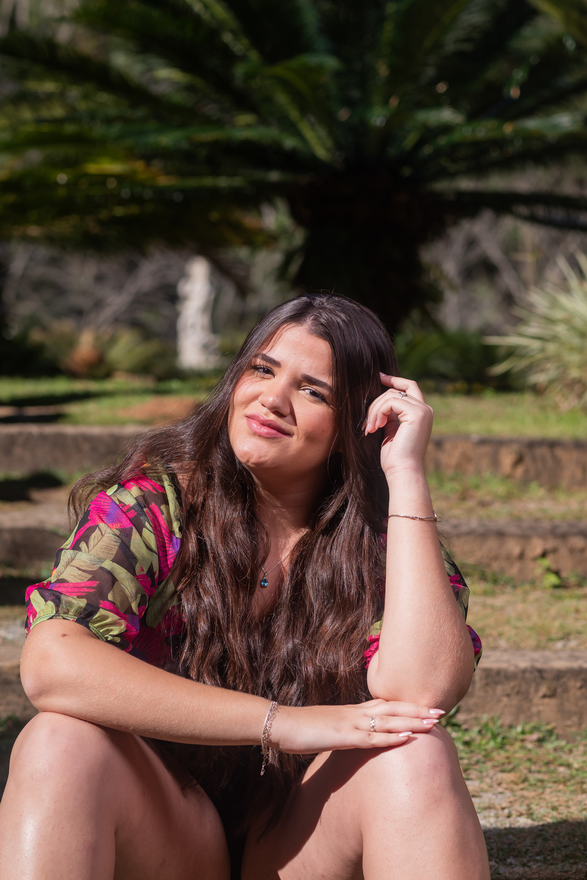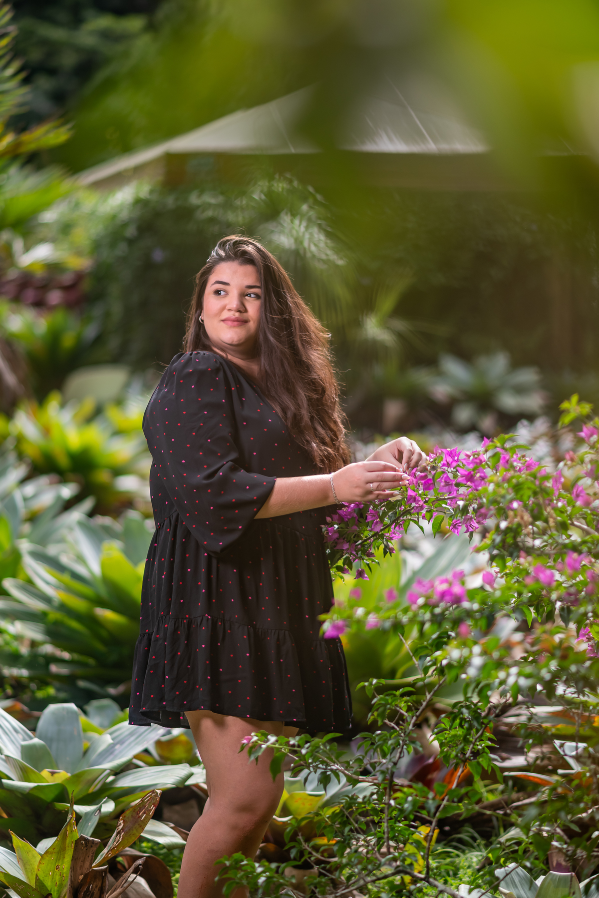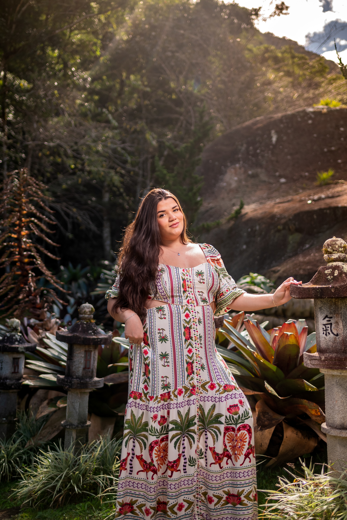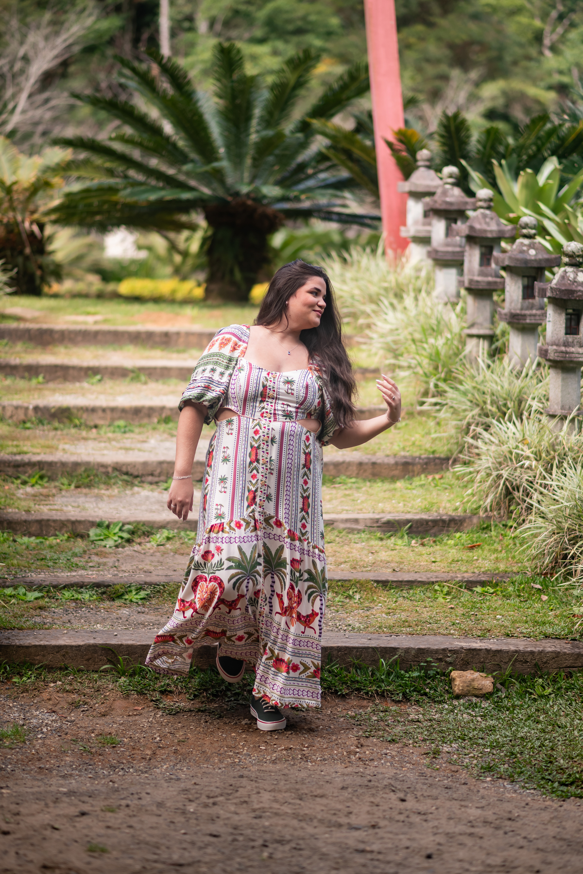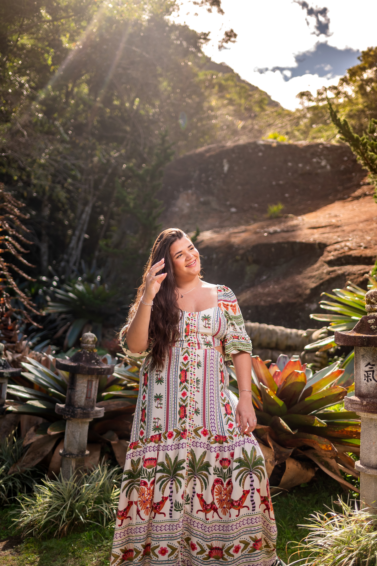 Alice, radiante em seu vestido em cores quentes, passeou pelos caminhos floridos do jardim, cercada por árvores frondosas e flores coloridas. A luz suave do entardecer iluminava seu sorriso, enquanto ela se deixava levar pela atmosfera mágica do local. O som do vento nas folhas e o canto dos pássaros criavam uma trilha sonora perfeita para esses momentos únicos.