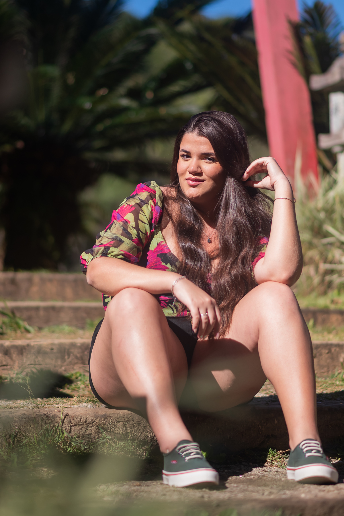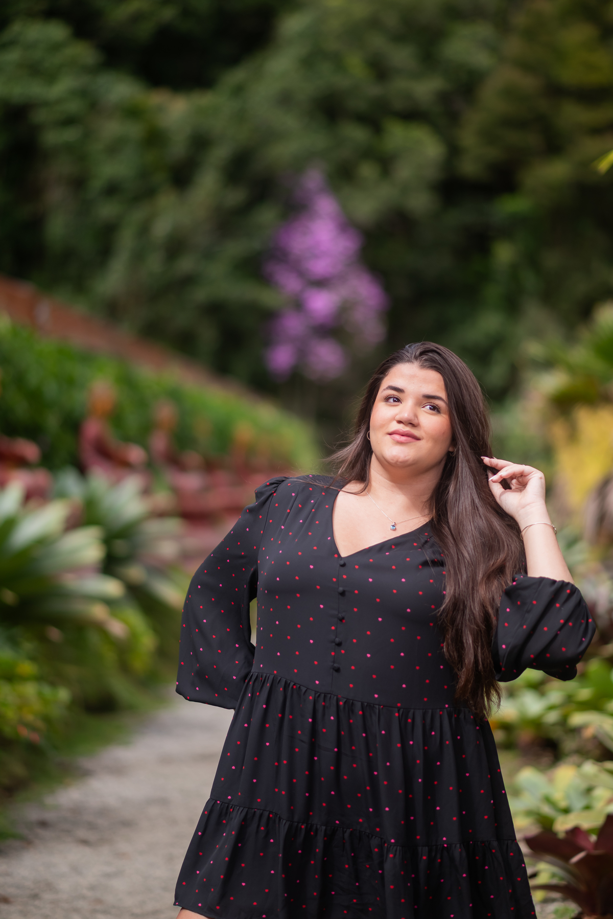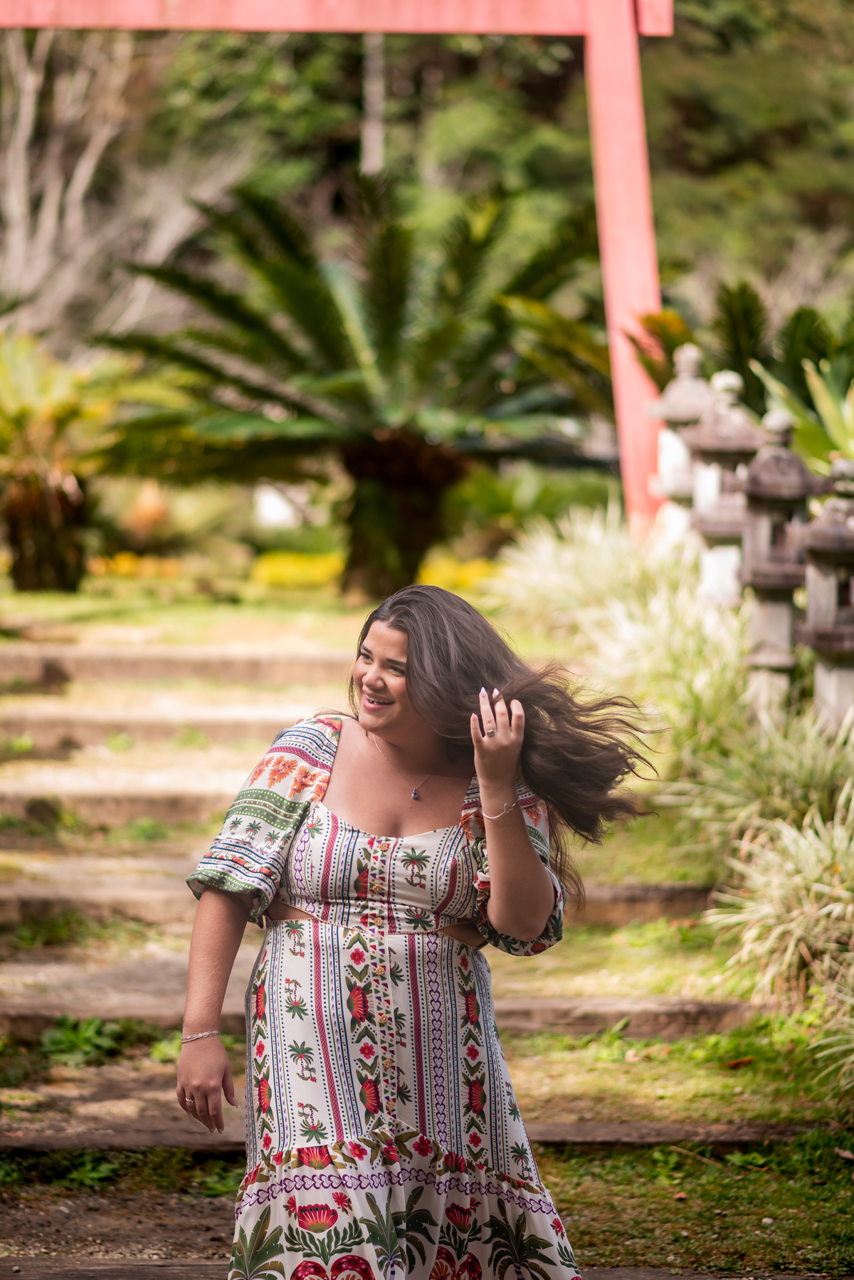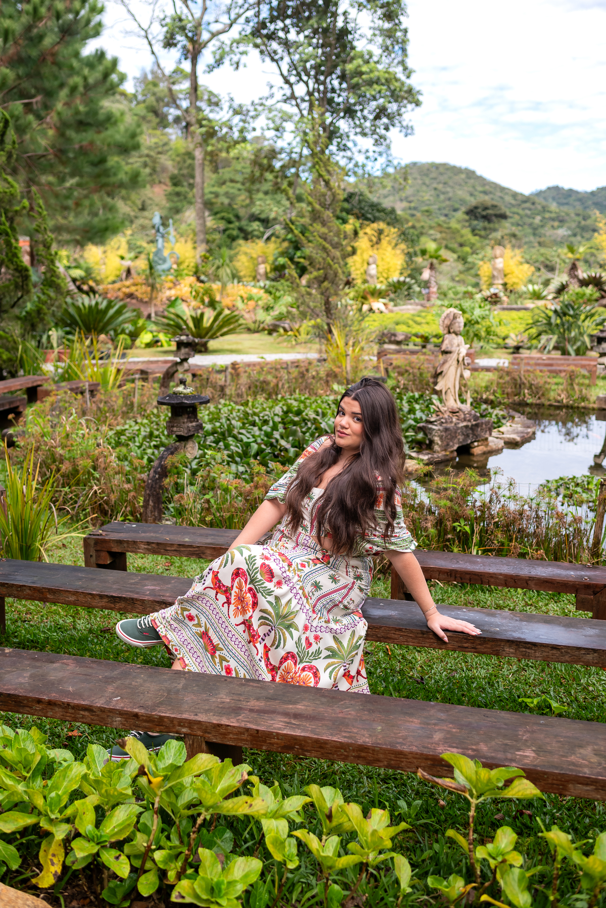 Alice, radiante em seu vestido em cores quentes, passeou pelos caminhos floridos do jardim, cercada por árvores frondosas e flores coloridas. A luz suave do entardecer iluminava seu sorriso, enquanto ela se deixava levar pela atmosfera mágica do local. O som do vento nas folhas e o canto dos pássaros criavam uma trilha sonora perfeita para esses momentos únicos.
