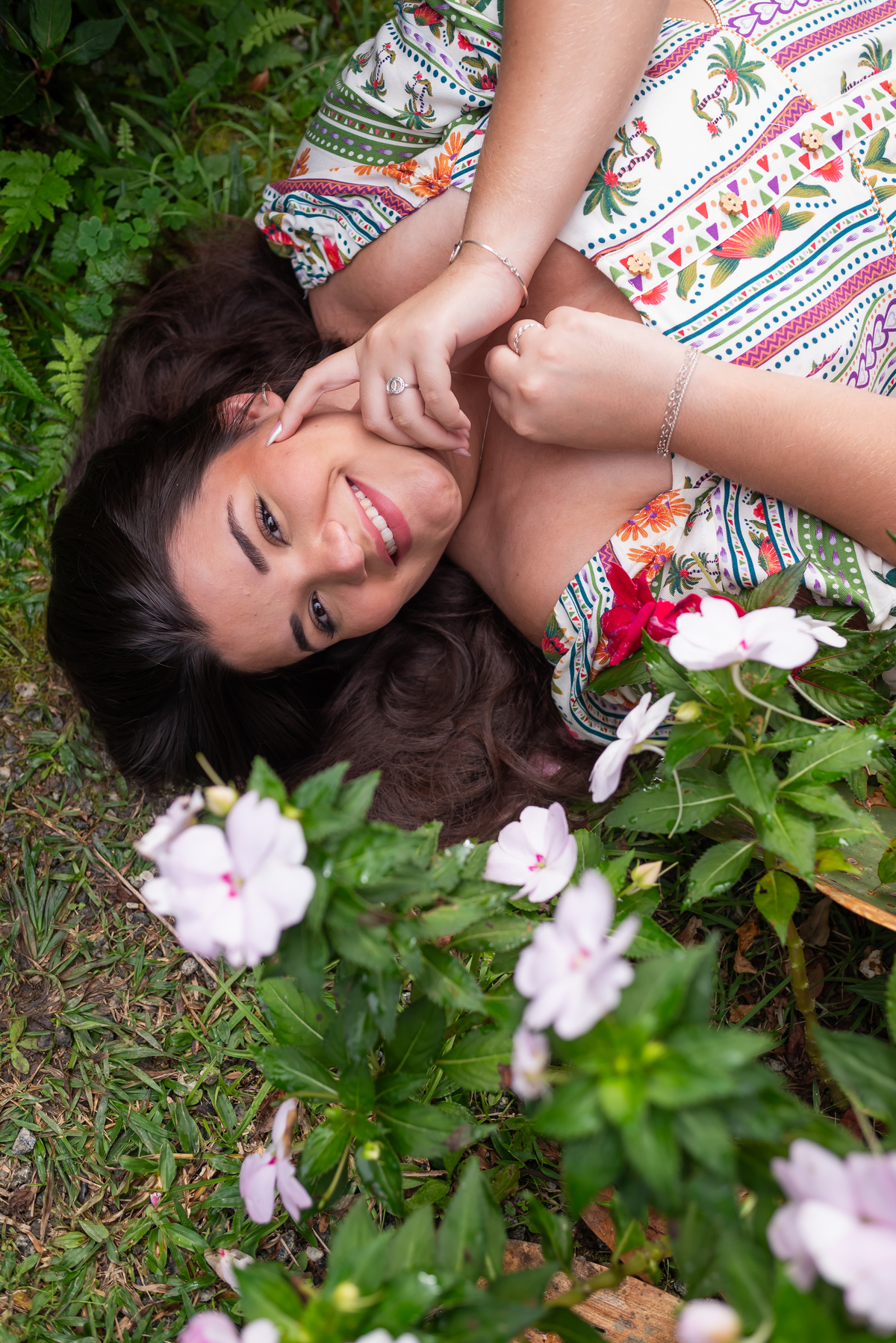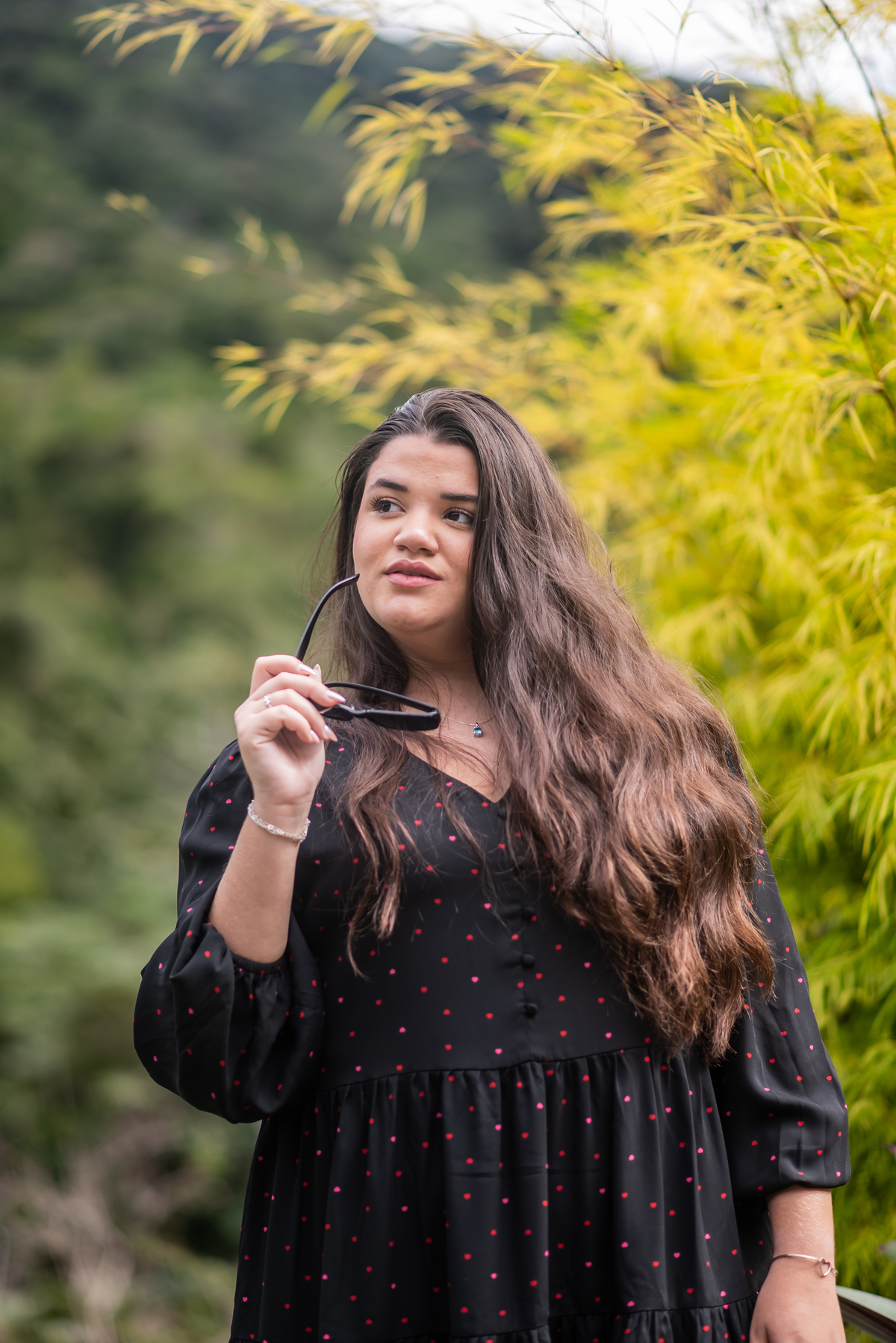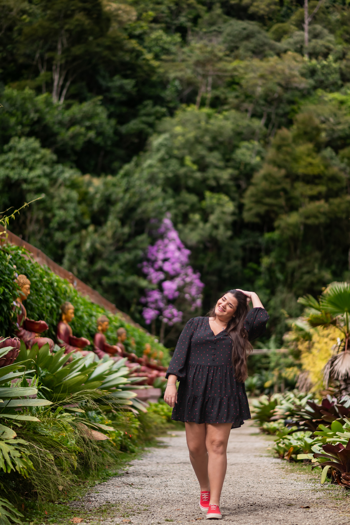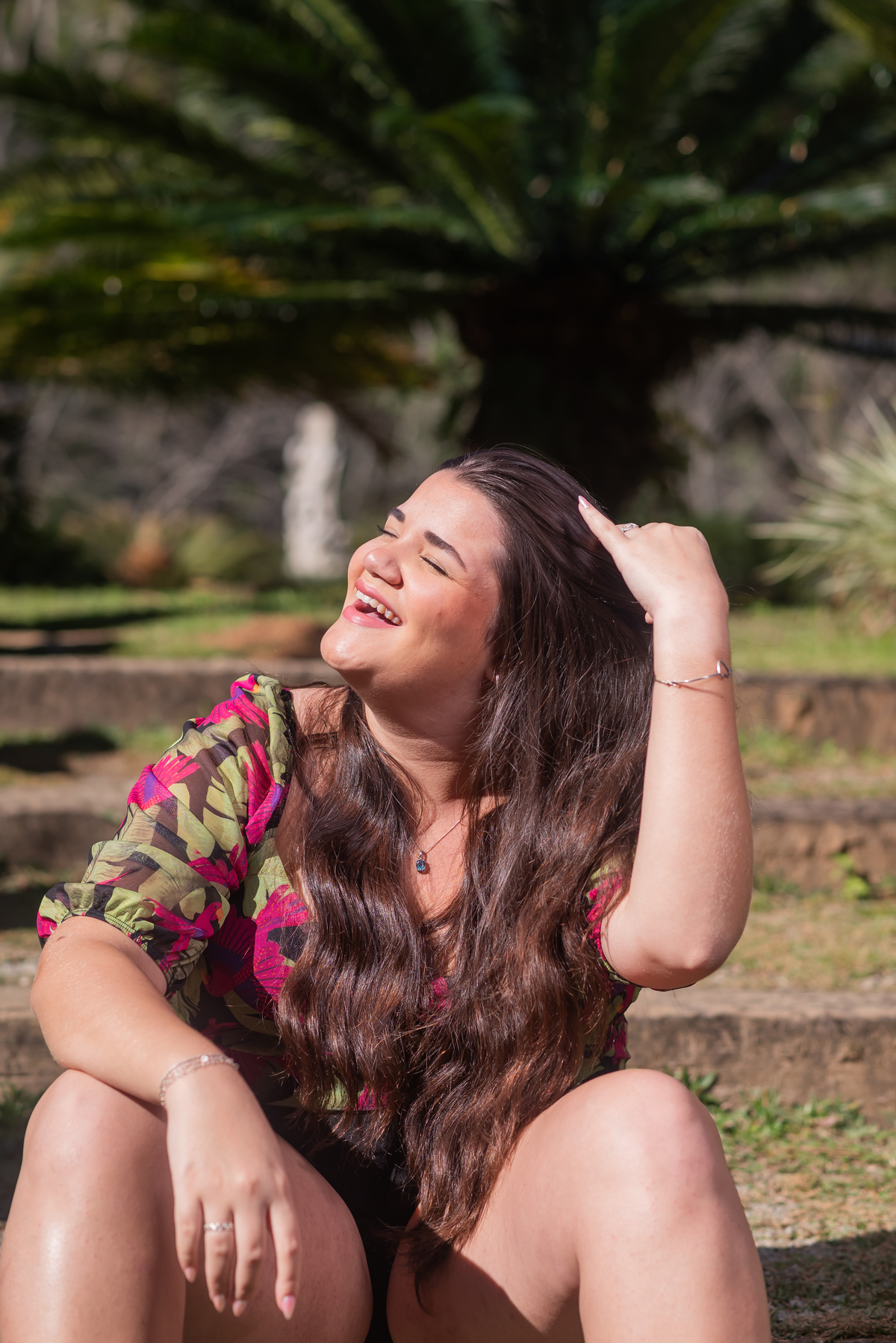 Alice, radiante em seu vestido em cores quentes, passeou pelos caminhos floridos do jardim, cercada por árvores frondosas e flores coloridas. A luz suave do entardecer iluminava seu sorriso, enquanto ela se deixava levar pela atmosfera mágica do local. O som do vento nas folhas e o canto dos pássaros criavam uma trilha sonora perfeita para esses momentos únicos.