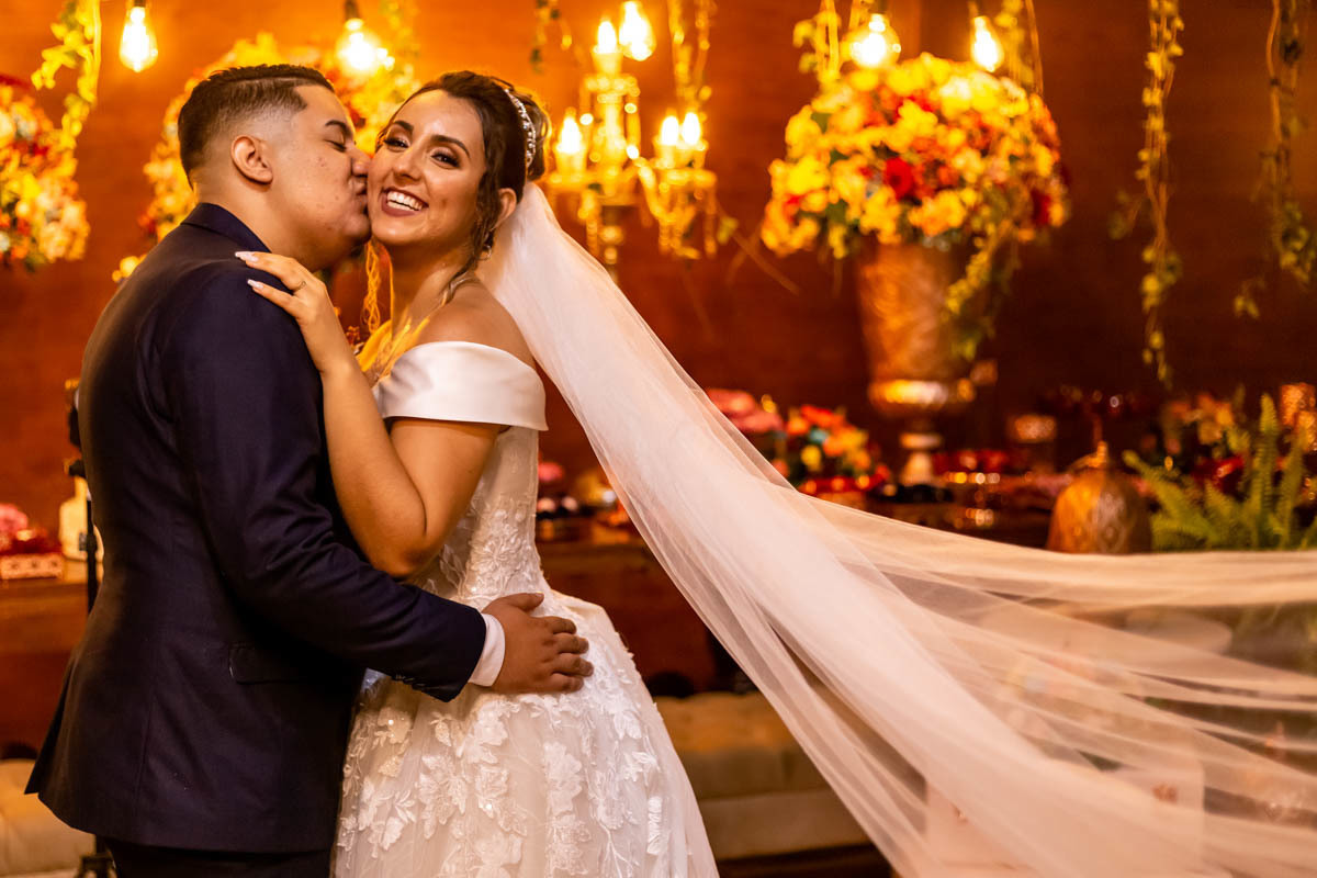 foto do casal com véu da noiva